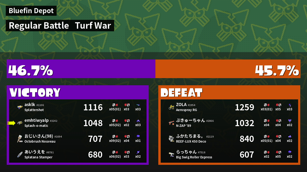 | Medals | #1 Enemy-Base Inker #1 Splat Assister #1 Crab Tank User | ||
