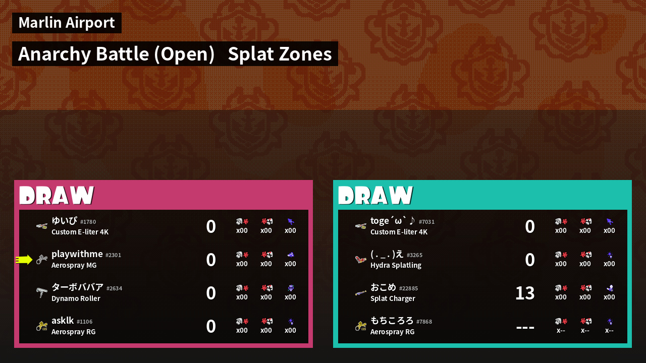 | Mode | Splat Zones - Anarchy Battle (Open) | ||