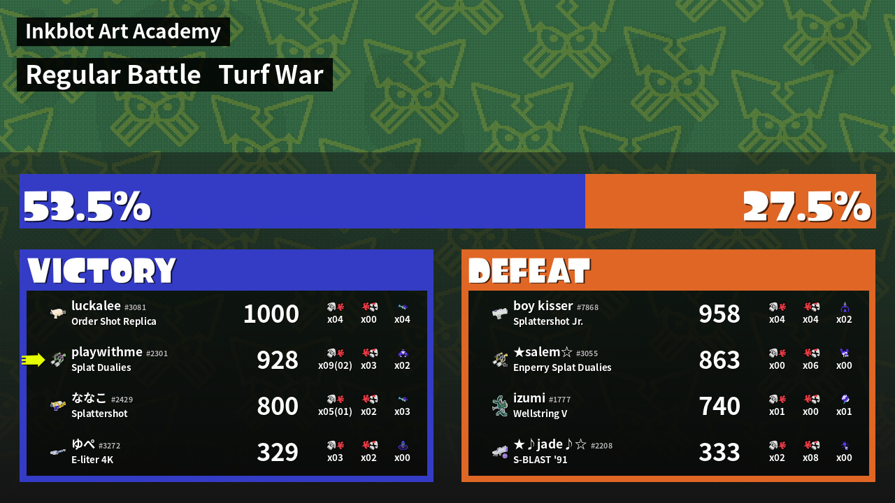 | Medals | #1 Overall Splatter #1 Popular Target #1 Enemy-Base Inker | ||