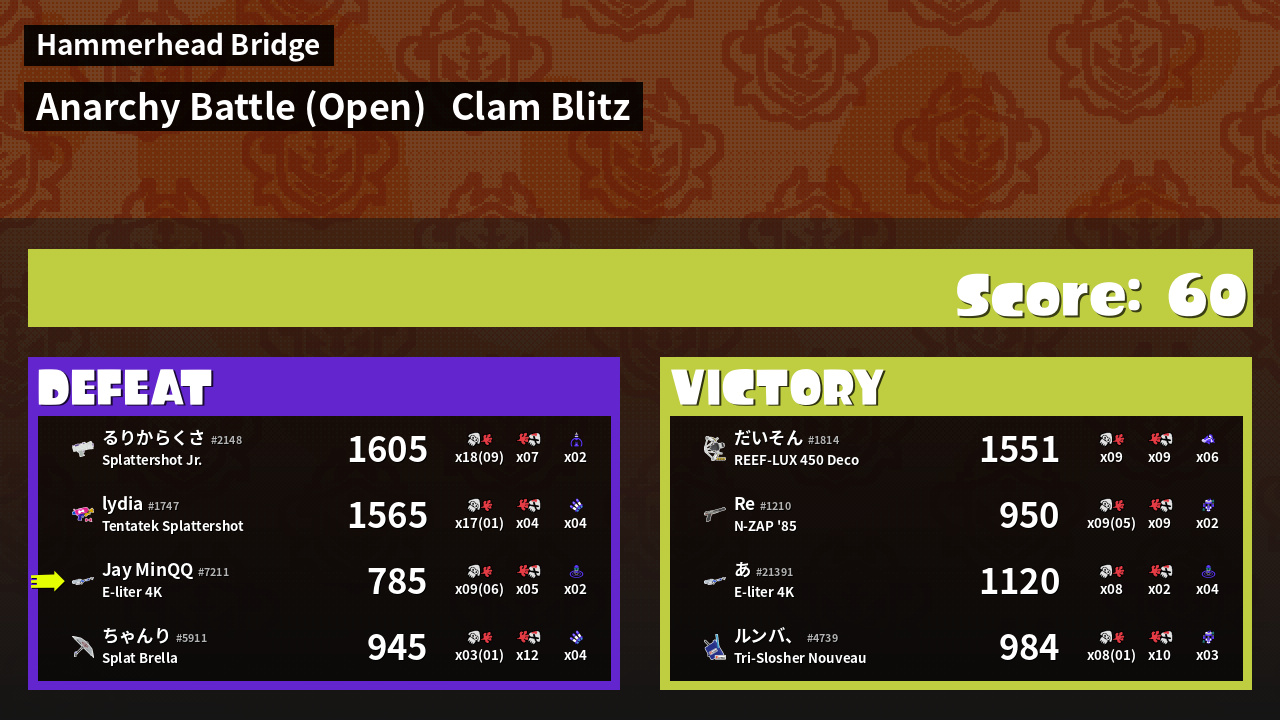| Medals | #1 Clam Carrier #1 Wave Breaker User #2 Splat Assister | ||