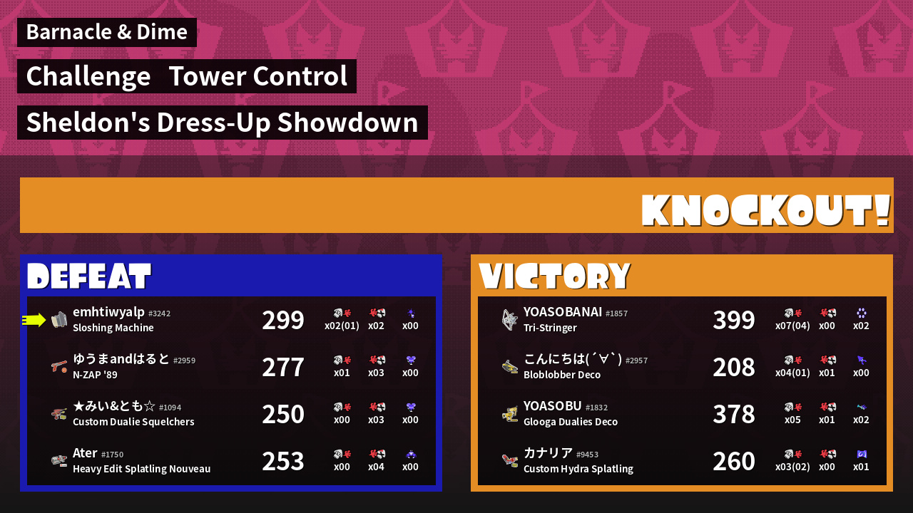 | Medals | #1 Overall Splatter #1 Turf Inker #1 Enemy Splatter | ||