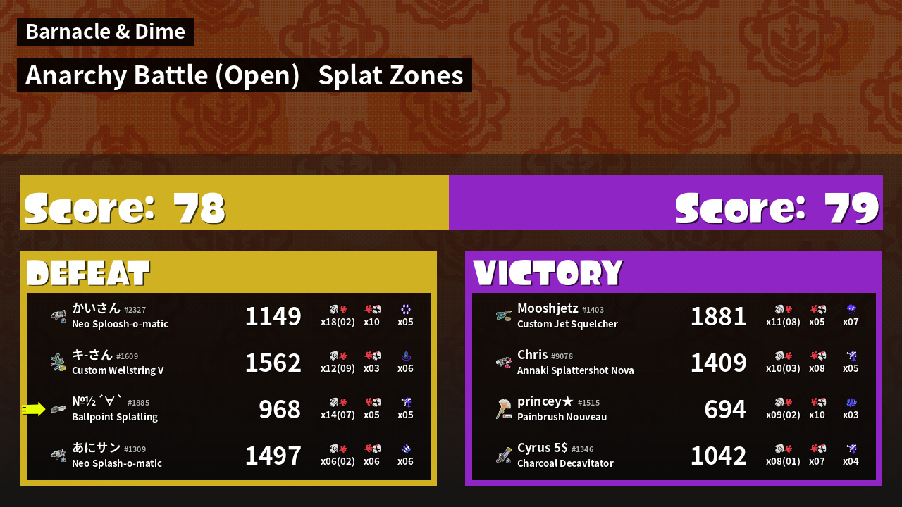 | Mode | Splat Zones - Anarchy Battle (Open) | ||