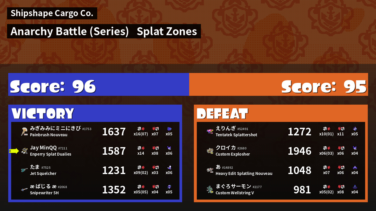 | Medals | #1 Splat Zone Inker #1 Enemy Splatter #1 Damage Taker | ||