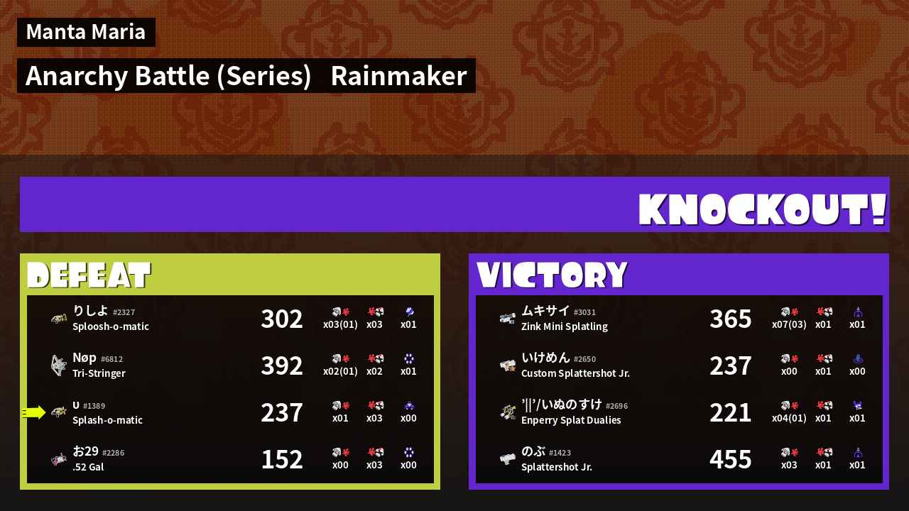 | Medals | #1 Ink Consumer #2 Popular Target #2 Enemy Splatter | ||