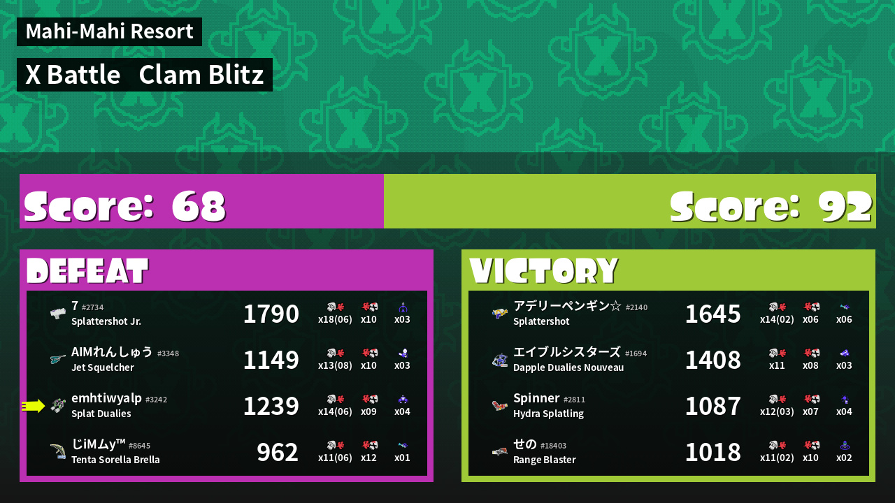 | Medals | #1 Damage Taker #1 Crab Tank User #2 Overall Splatter | ||