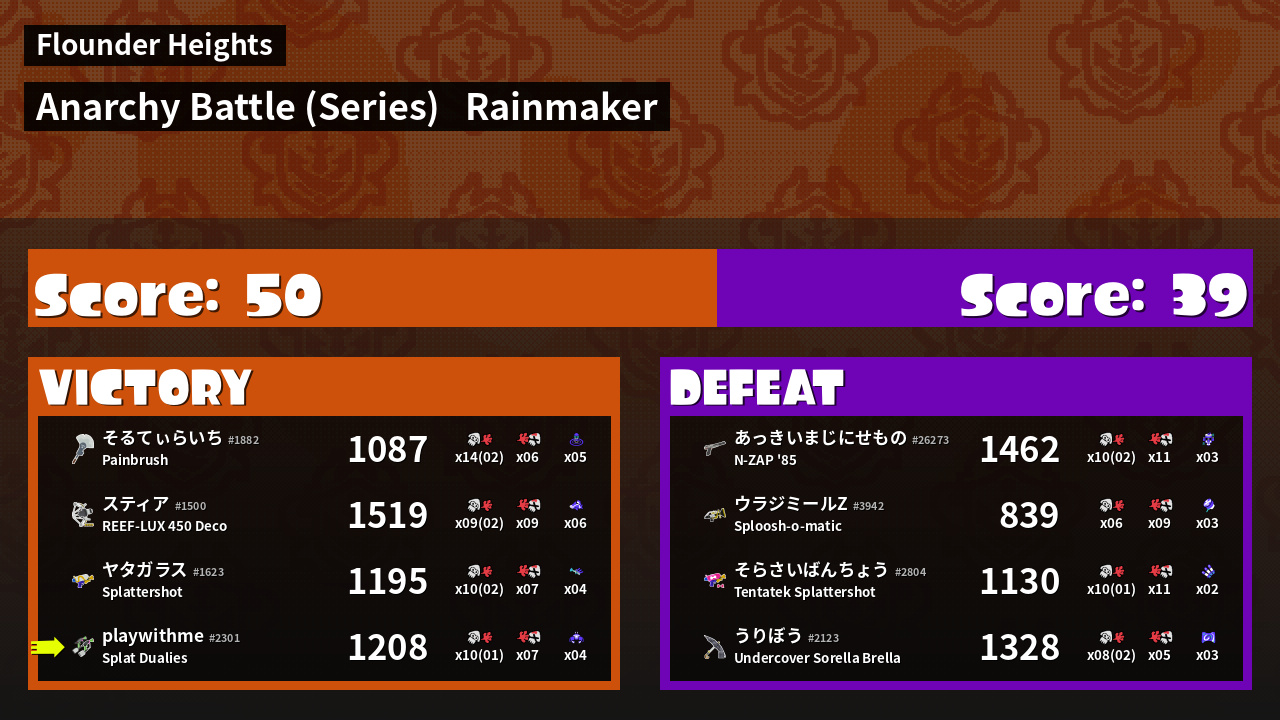 | Medals | #1 Rainmaker Stopper #1 Crab Tank User #2 Overall Splatter | ||