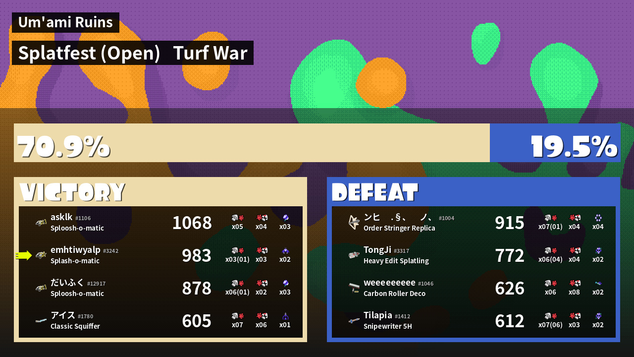 | Medals | #1 Splat Assister #1 Damage Taker #2 Turf Inker | ||