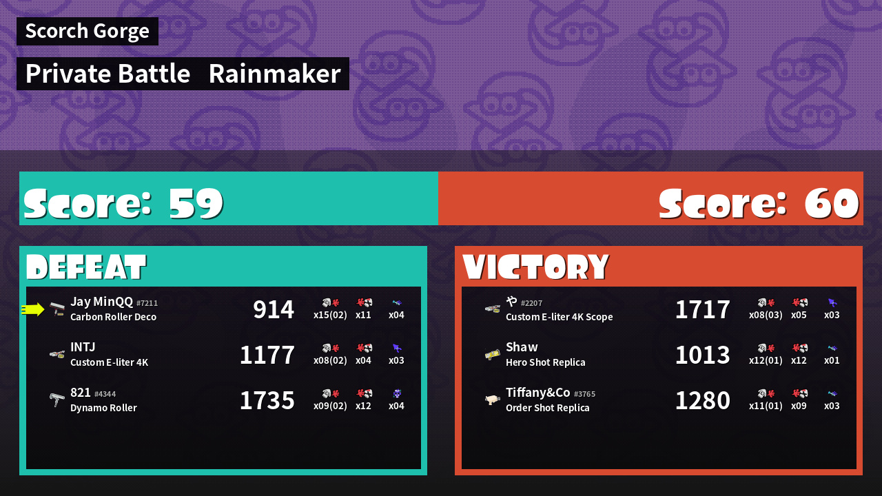 | Medals | #1 Overall Splatter #1 Popular Target #1 Enemy Splatter | ||