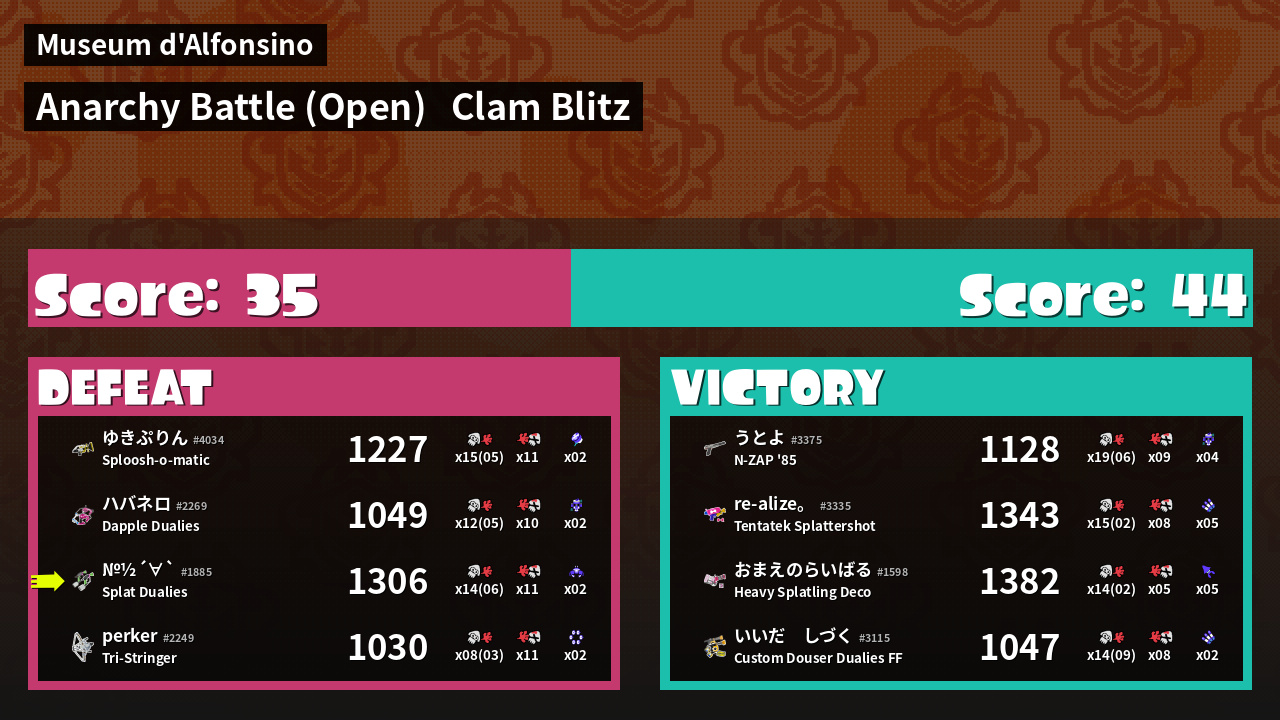 | Medals | #1 Turf Inker #1 Splat Assister #1 Ink Consumer | ||