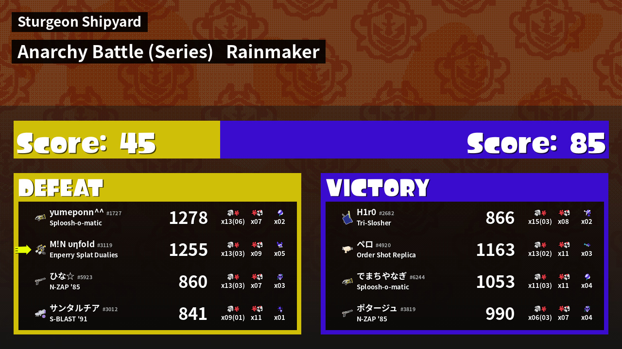 | Weapon | Enperry Splat Dualies ( Curling Bomb / Triple Splashdown) | ||