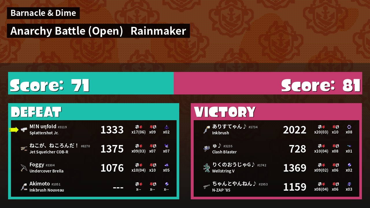 | Mode | Rainmaker - Anarchy Battle (Open) | ||