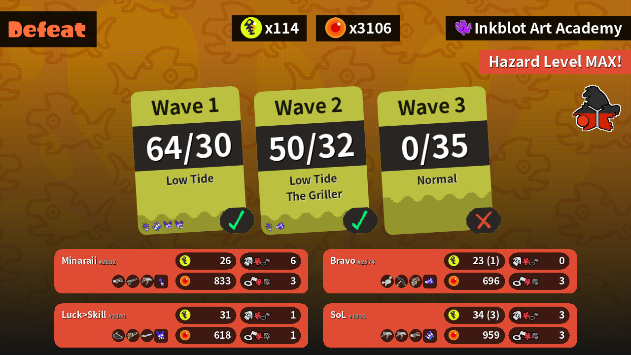 | Weapons | Range Blaster N-ZAP '85 Grizzco Roller | Grizzco Roller Grizzco Roller Range Blaster | Bloblobber Squeezer Classic Squiffer | Luna Blaster Undercover Brella Douser Dualies FF |