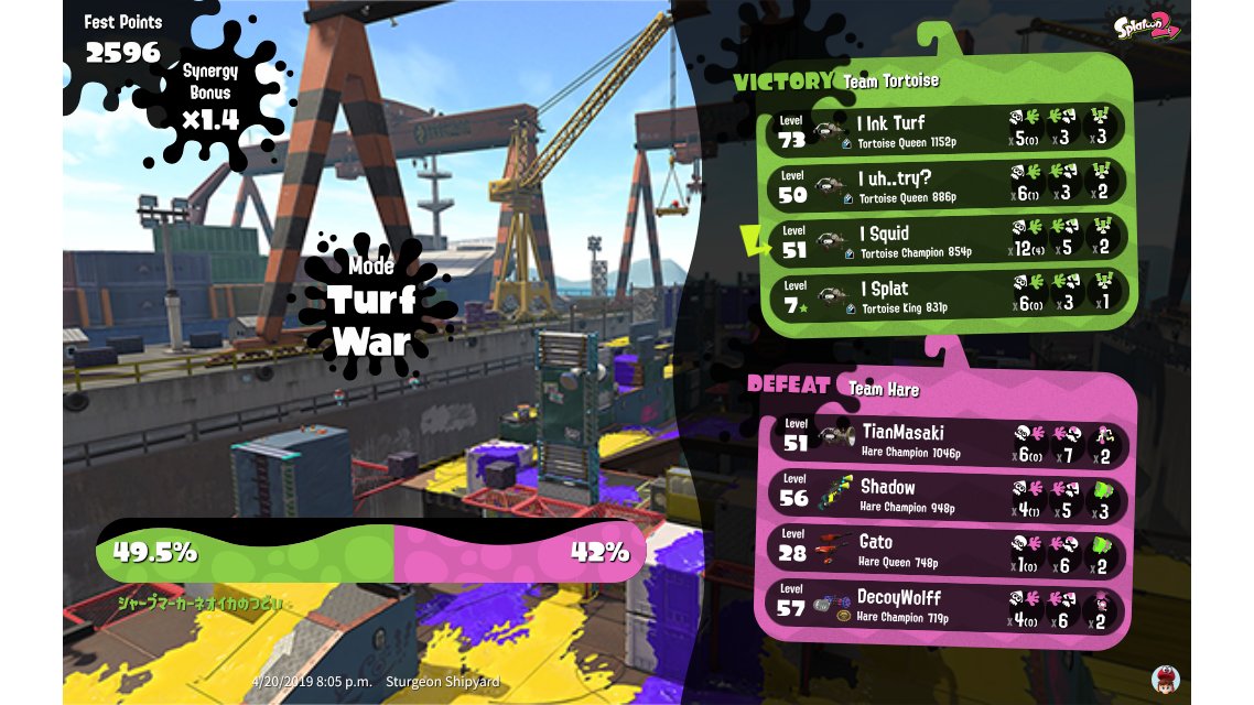 | Splatfest Title | カメ Champion 114 → カメ Champion 240 | ||||||||||||||||||||||||||||||||||||||||