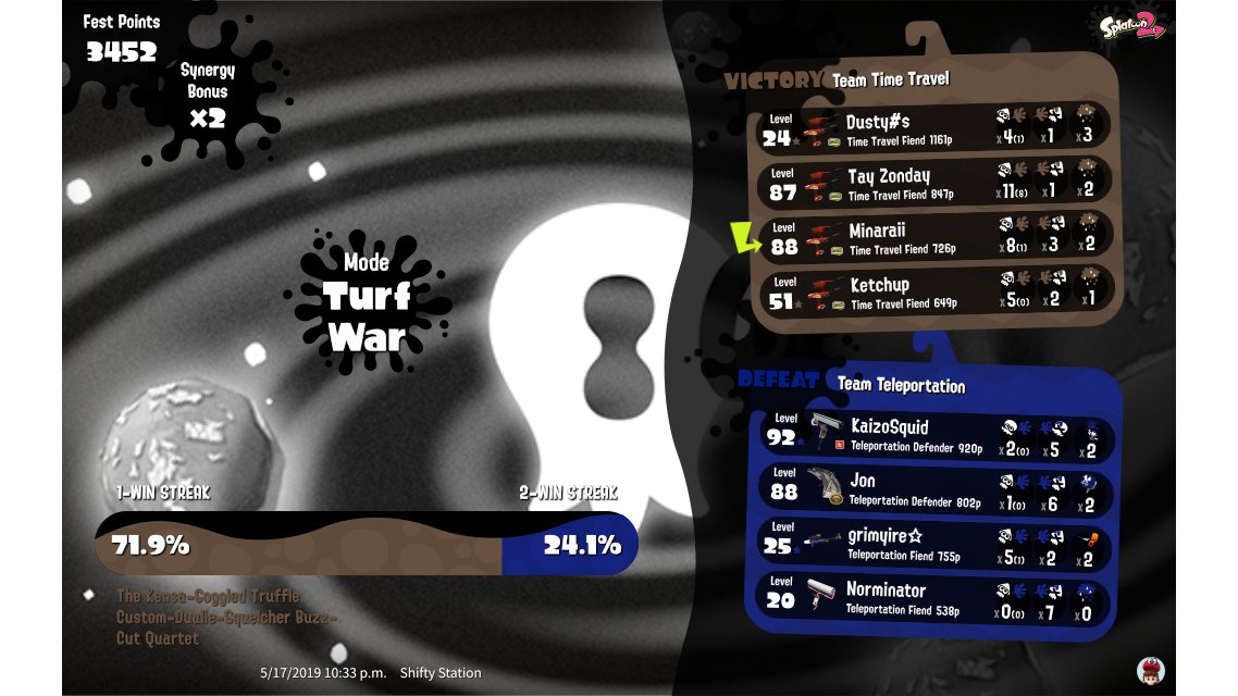 | Splatfest Title | Time Travel Fiend 80 → Time Travel Defender 10 | ||||||||||||||||||||||||||||||||||||||||