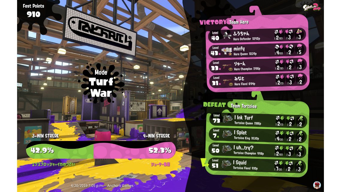 | Splatfest Title | カメ Fiend 170 → カメ Fiend 190 | ||||||||||||||||||||||||||||||||||