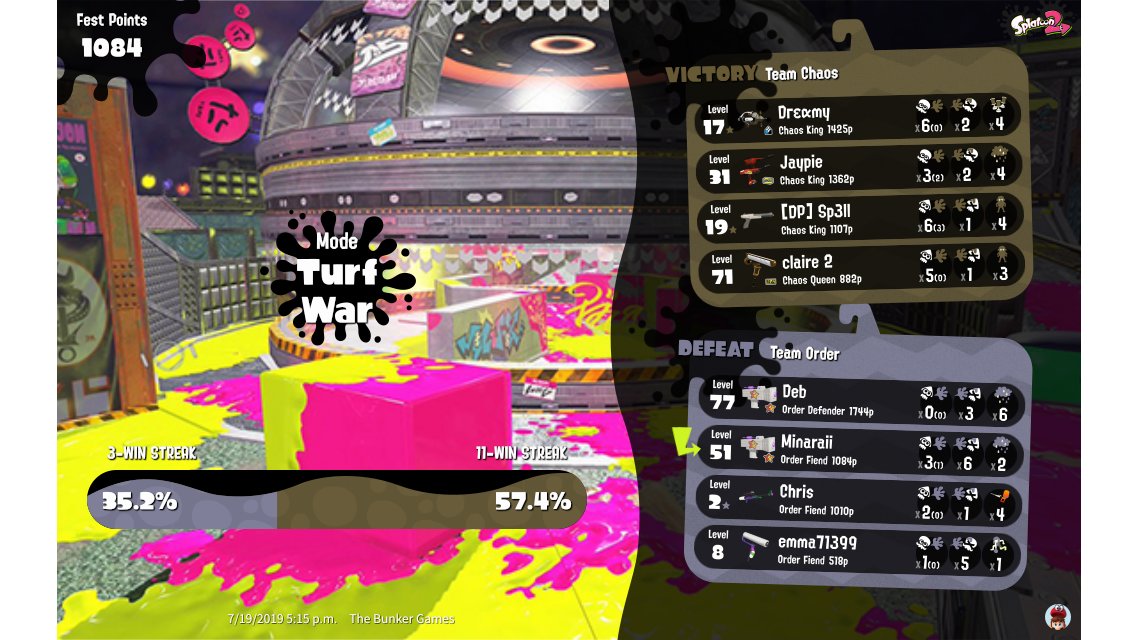 | Splatfest Title | 秩序 Fiend 141 → 秩序 Fiend 161 | |||||||||||||||||||||||||||||||||||||