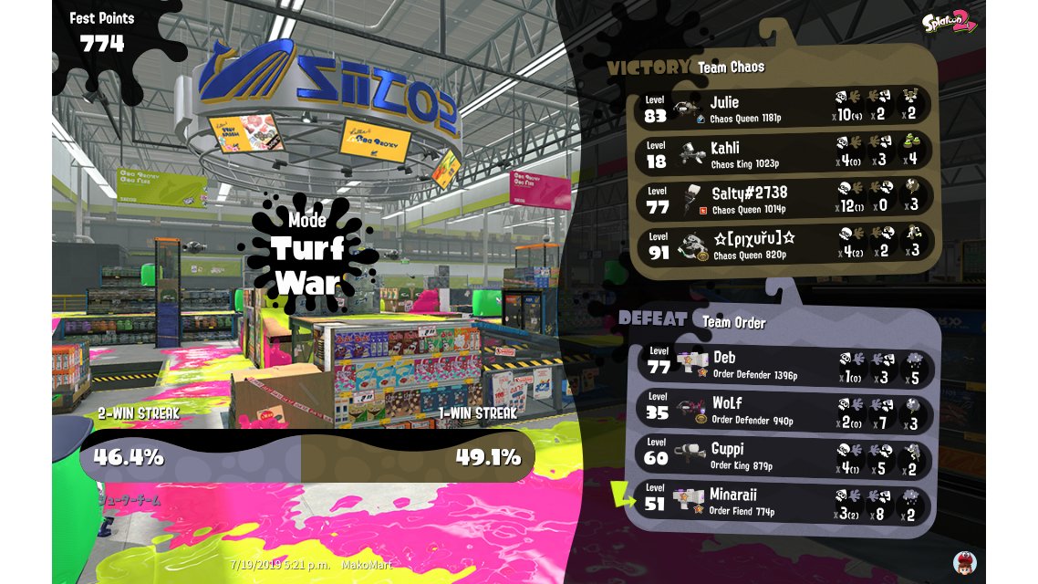 | Splatfest Title | 秩序 Fiend 161 → 秩序 Fiend 181 | |||||||||||||||||||||||||||||||||||||