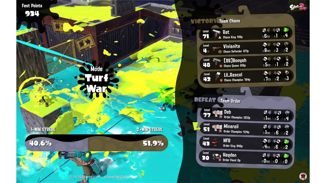 | Splatfest Title | 秩序 Champion 312 → 秩序 Champion 332 | |||||||||||||||||||||||||||||||||||||