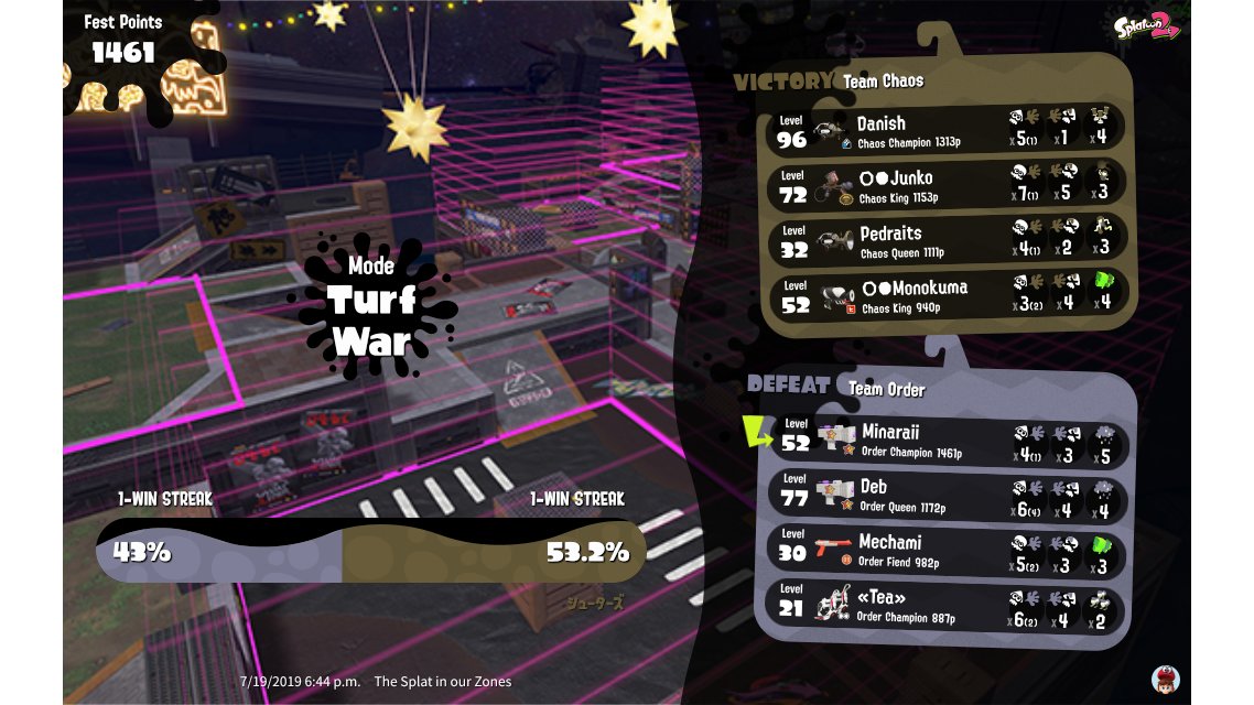 | Splatfest Title | 秩序 Champion 570 → 秩序 Champion 590 | |||||||||||||||||||||||||||||||||||||