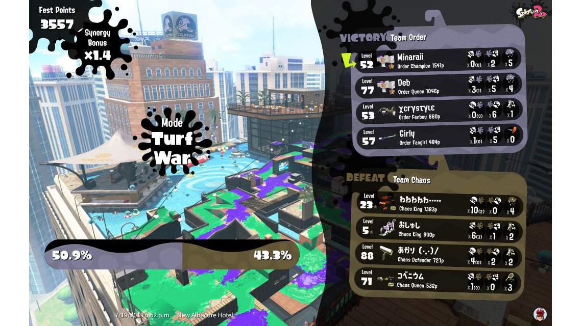 | Splatfest Title | 秩序 Champion 590 → 秩序 Champion 716 | |||||||||||||||||||||||||||||||||||||