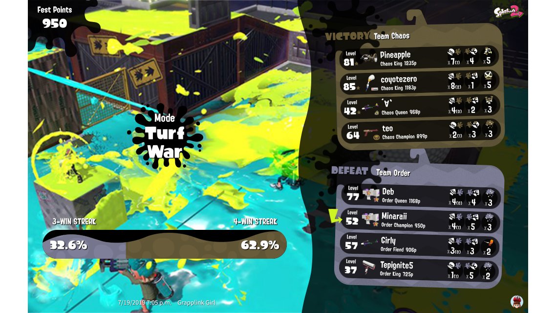| Splatfest Title | 秩序 Champion 950 → 秩序 Champion 970 | ||||||||||||||||||||||||||||||||||||||||