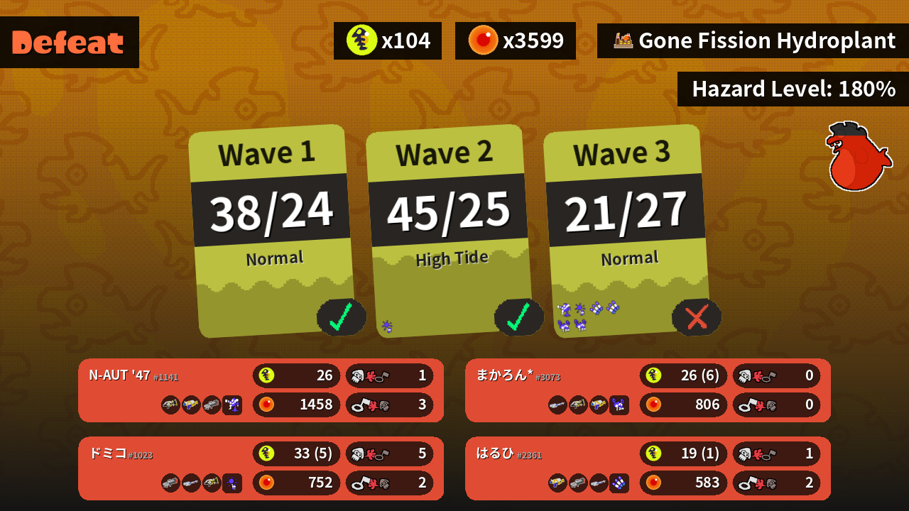 | Weapons | Sploosh-o-matic Splattershot S-BLAST '92 | S-BLAST '92 E-liter 4K Sploosh-o-matic | E-liter 4K Sploosh-o-matic Splattershot | Splattershot S-BLAST '92 E-liter 4K |