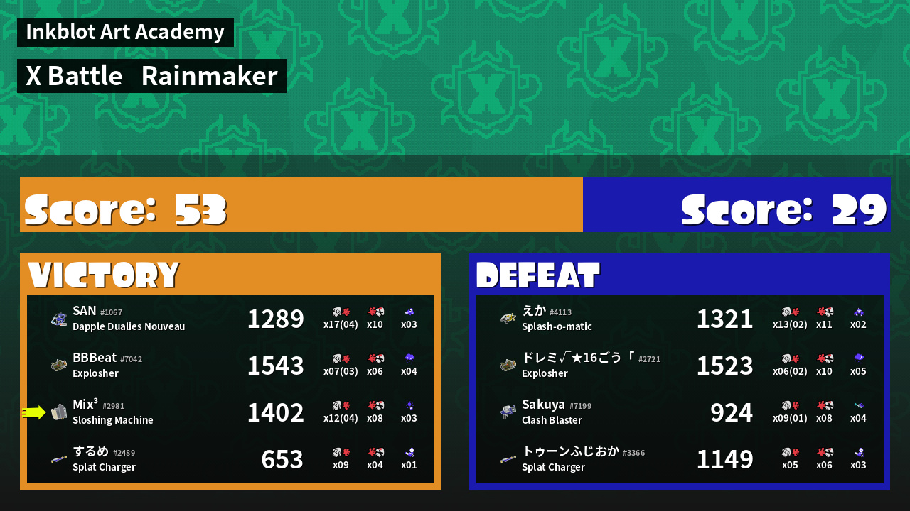 | Medals | #1 Splat Assister #1 Ink Consumer #2 Overall Splatter | ||
