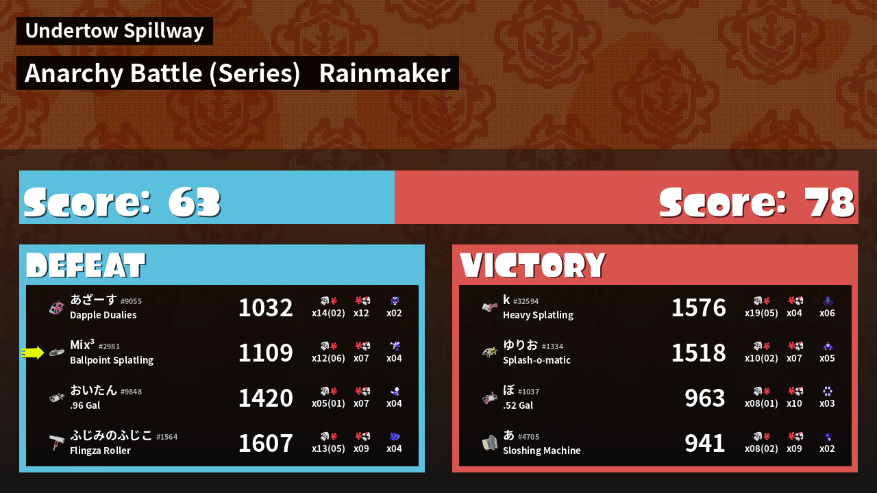 | Medals | #1 Popular Target #1 Splat Assister #1 Inkjet User | ||