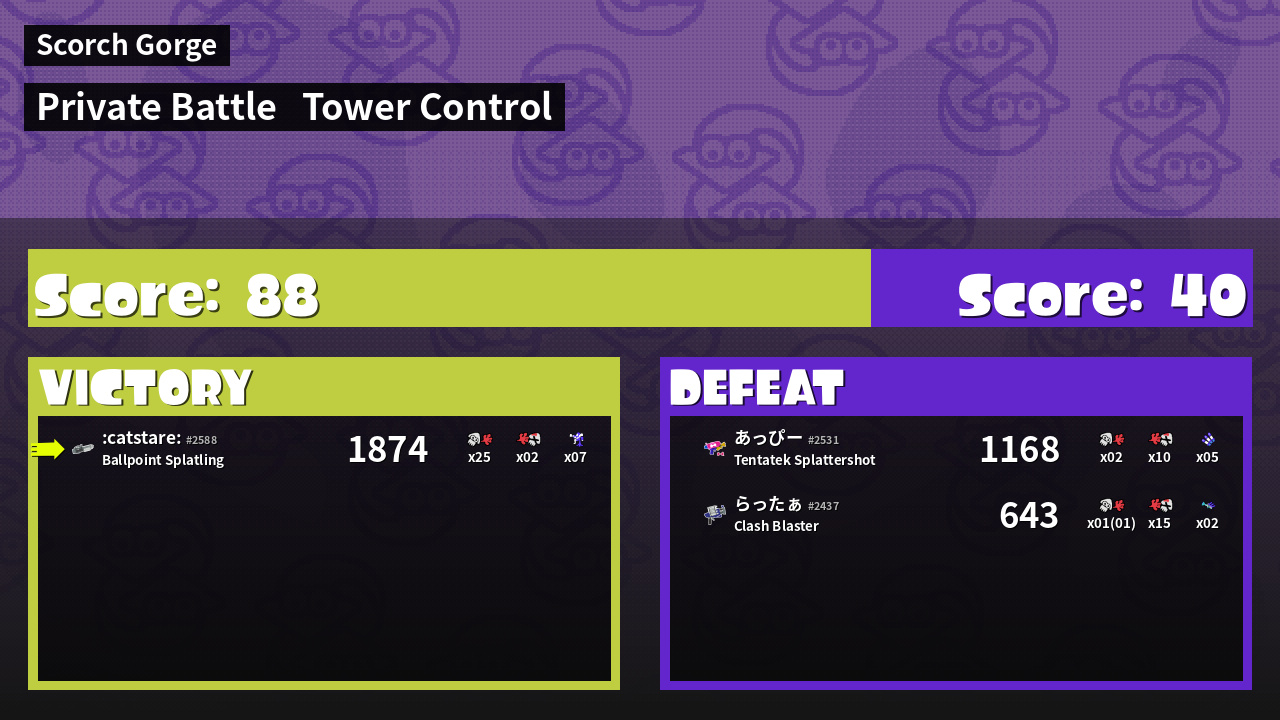 Kills / Deaths | 25 + 0 / 2 > Kill Ratio: 12.50 | ||