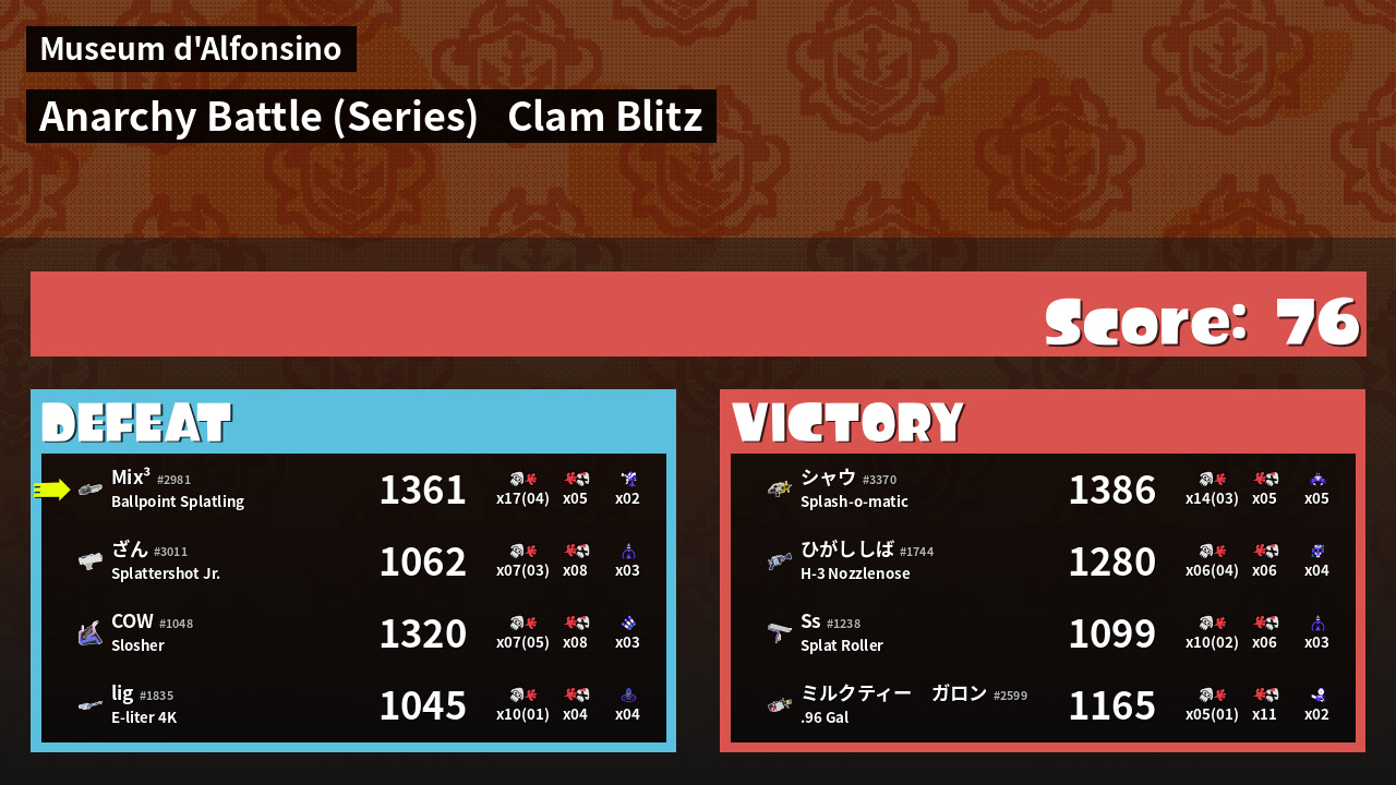 | Mode | Clam Blitz - Anarchy Battle (Series) | ||