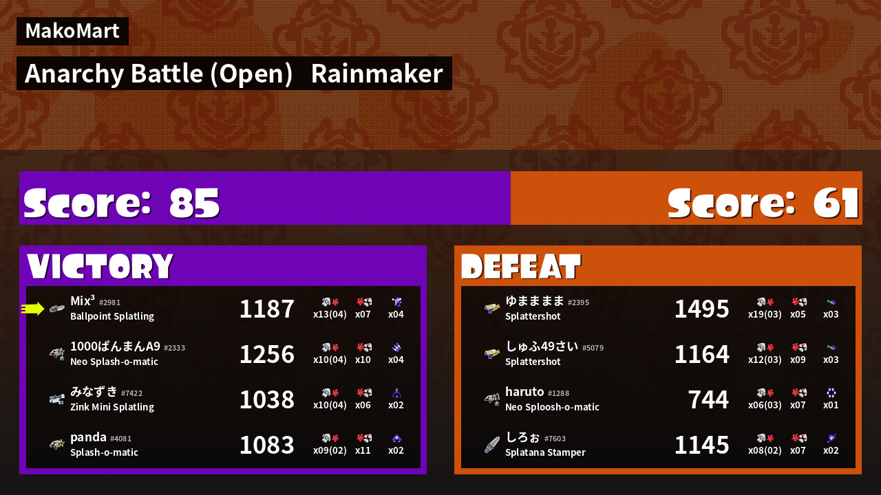 | Mode | Rainmaker - Anarchy Battle (Open) | ||