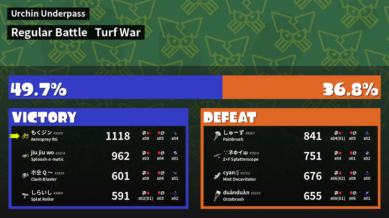 | Medals | #1 Overall Splatter #1 Turf Inker #1 Enemy-Base Inker | ||