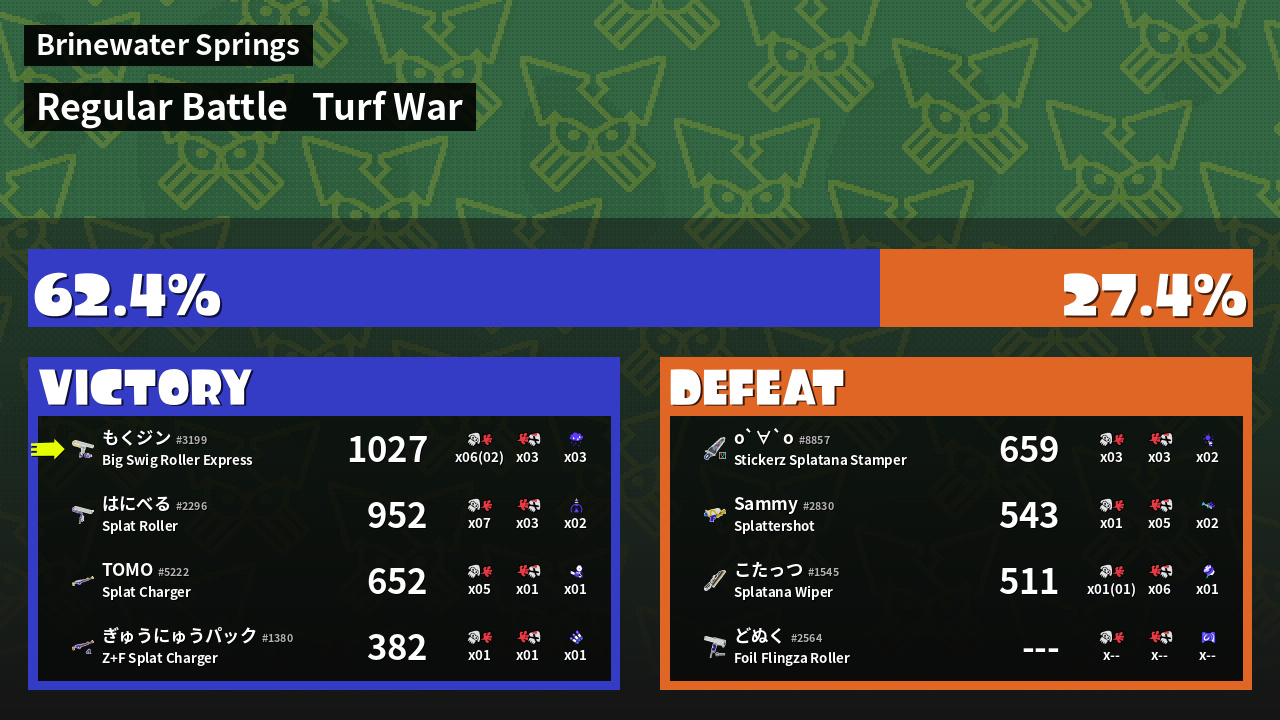 | Weapon | Big Swig Roller Express ( Angle Shooter / Ink Storm) | ||