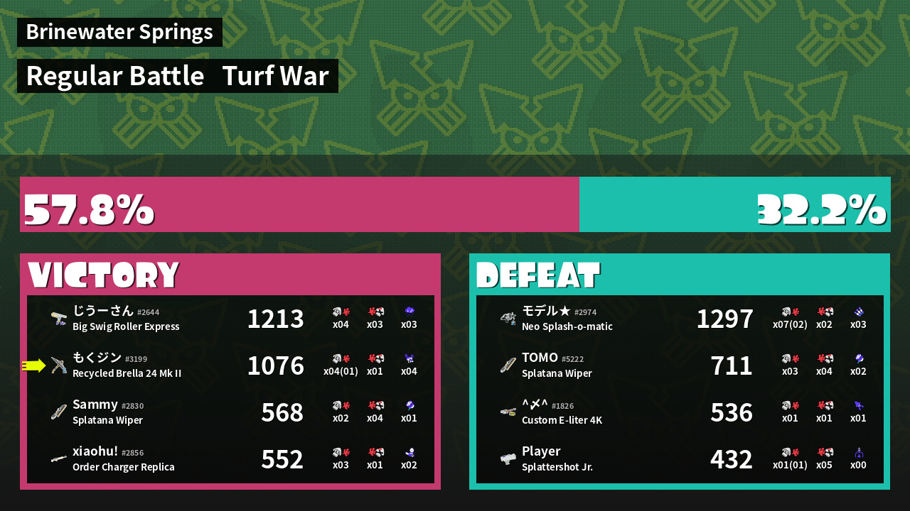 | Medals | #1 Overall Splatter #1 Enemy-Base Inker #1 Super Jump Spot | ||