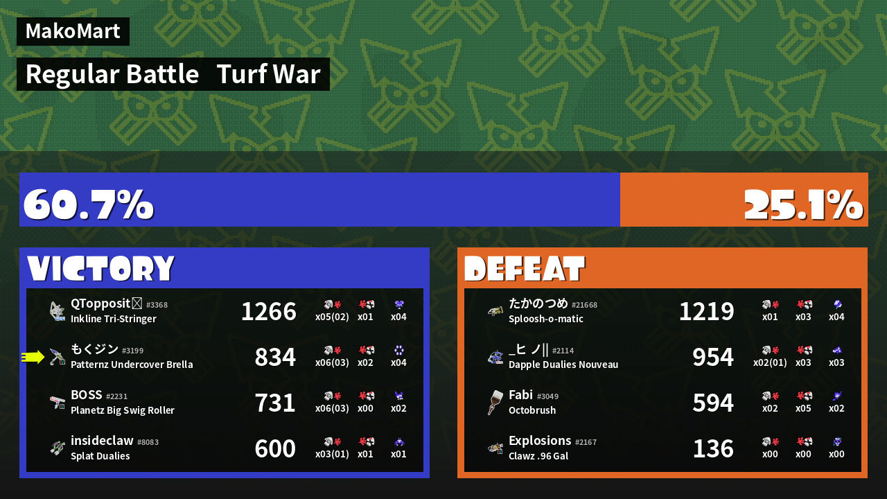 | Medals | #1 Overall Splatter #1 Home-Base Inker #1 Enemy Splatter | ||