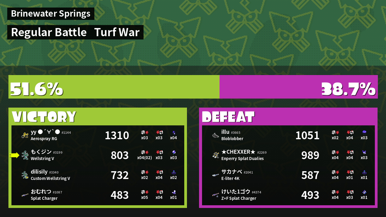 | Medals | #1 Splat Assister #1 Damage Taker #1 Ink Consumer | ||