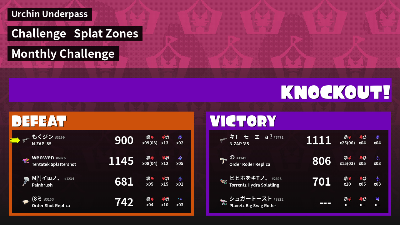 | Medals | #1 Overall Splatter #1 Splat Zone Guard #1 Enemy Splatter | ||