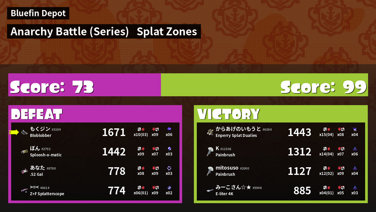 | Medals | #1 Overall Splatter #1 Splat Zone Inker #1 Splat Zone Guard | ||
