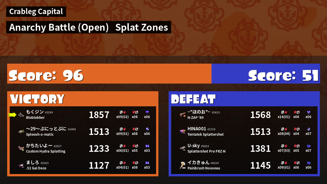 | Mode | Splat Zones - Anarchy Battle (Open) | ||