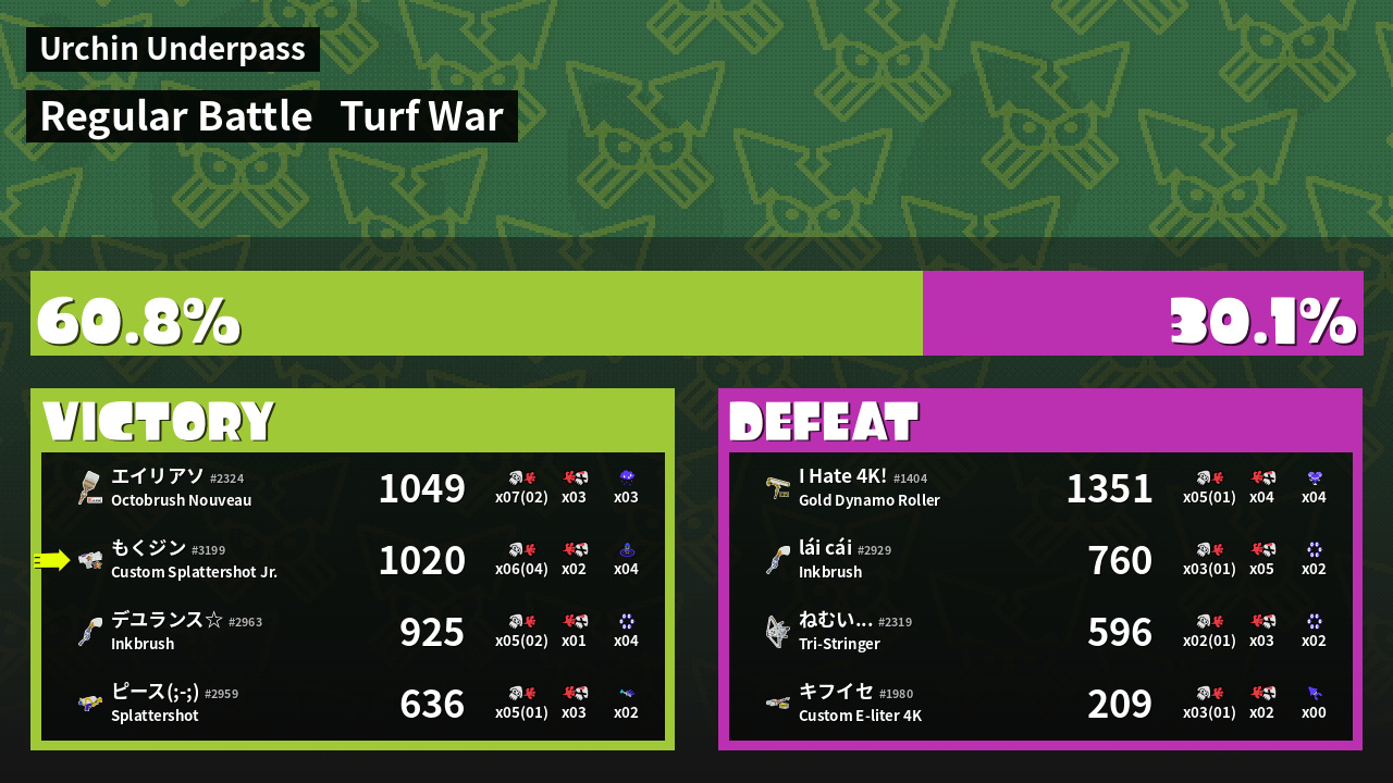 | Medals | #1 Home-Base Inker #1 Splat Assister #1 Ground Traveler | ||