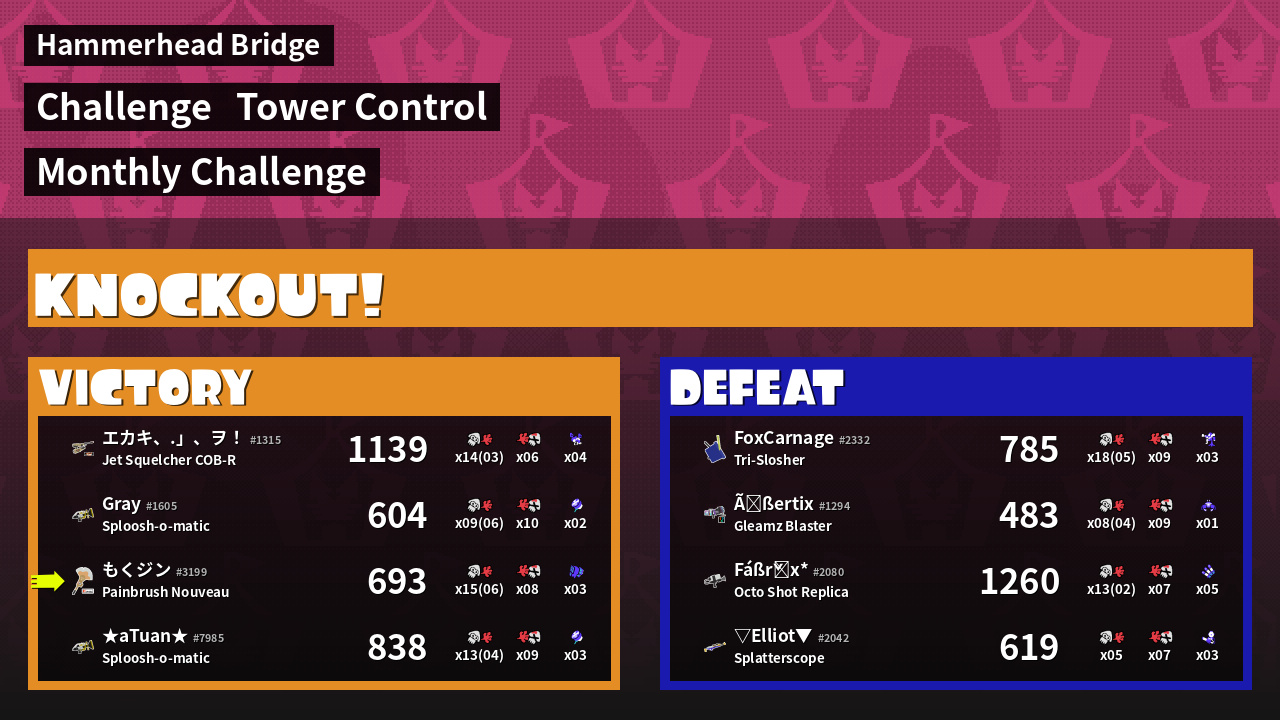 | Medals | #1 Overall Splatter #1 Splat Assister #1 Tower Stopper | ||