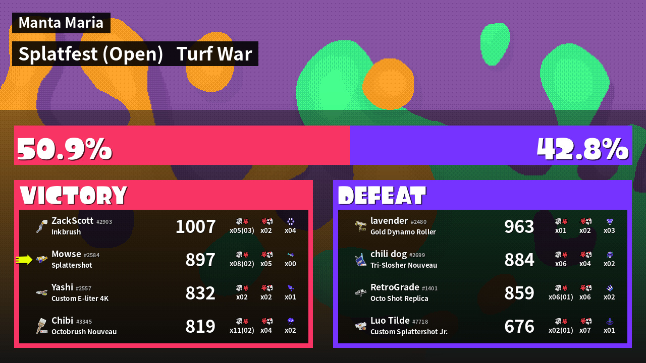 | Medals | #1 Enemy-Base Inker #2 Overall Splatter #2 Turf Inker | ||