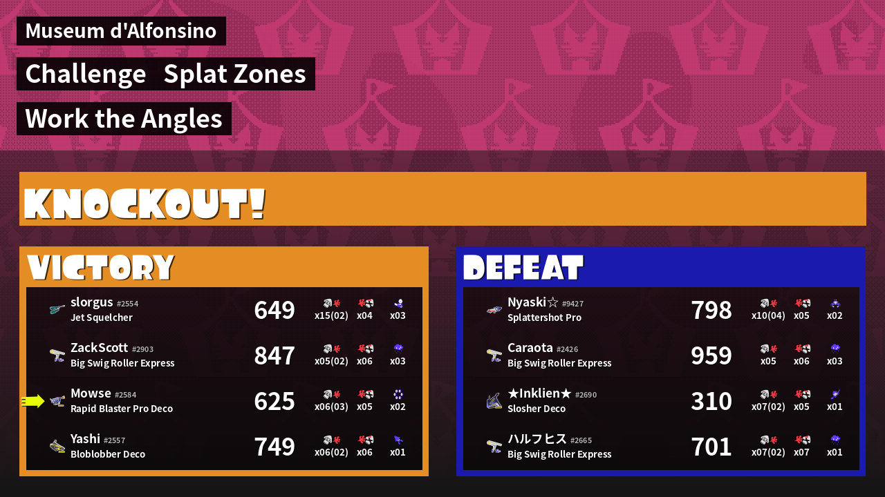 | Medals | #1 Splat Zone Guard #1 Splat Assister #1 Damage Taker | ||