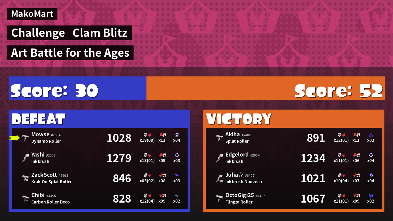 | Medals | #1 Overall Splatter #1 Score Booster #1 Clam Carrier | ||