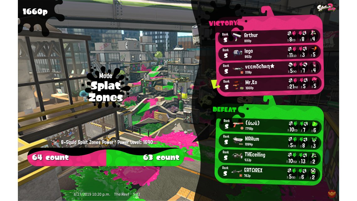 | Mode | Splat Zones - Ranked Battle | ||||||||||||||||||||||||||||||||||