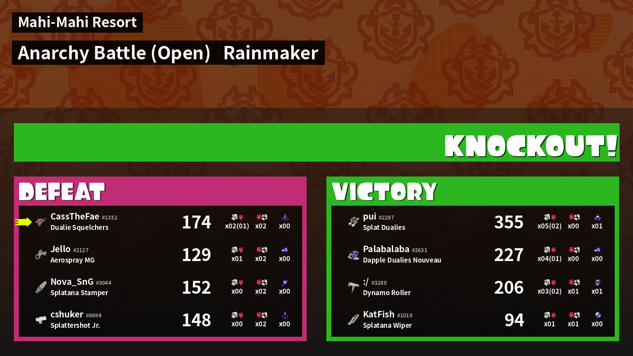 | Medals | #1 Overall Splatter #1 Turf Inker #1 Enemy Splatter | ||