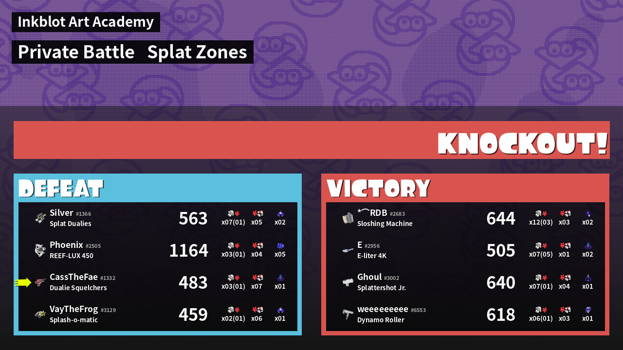 | Medals | #1 Splat Zone Guard #1 Splat Assister #1 Ground Traveler | ||