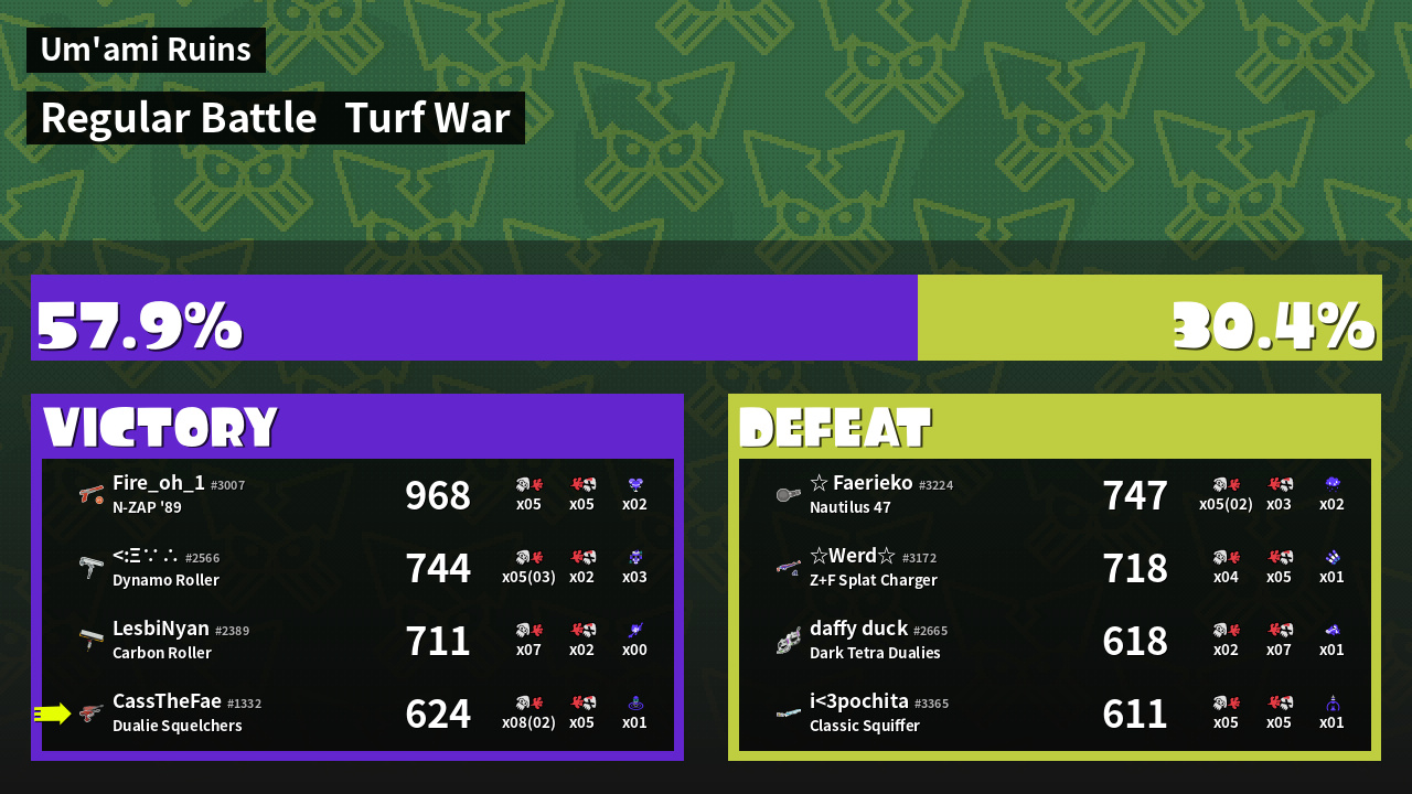 Kills / Deaths | 6 + 2 / 5 > Kill Ratio: 1.20 | ||