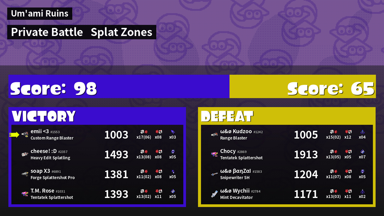 | Medals | #1 Overall Splatter #1 Popular Target #1 Enemy Splatter | ||