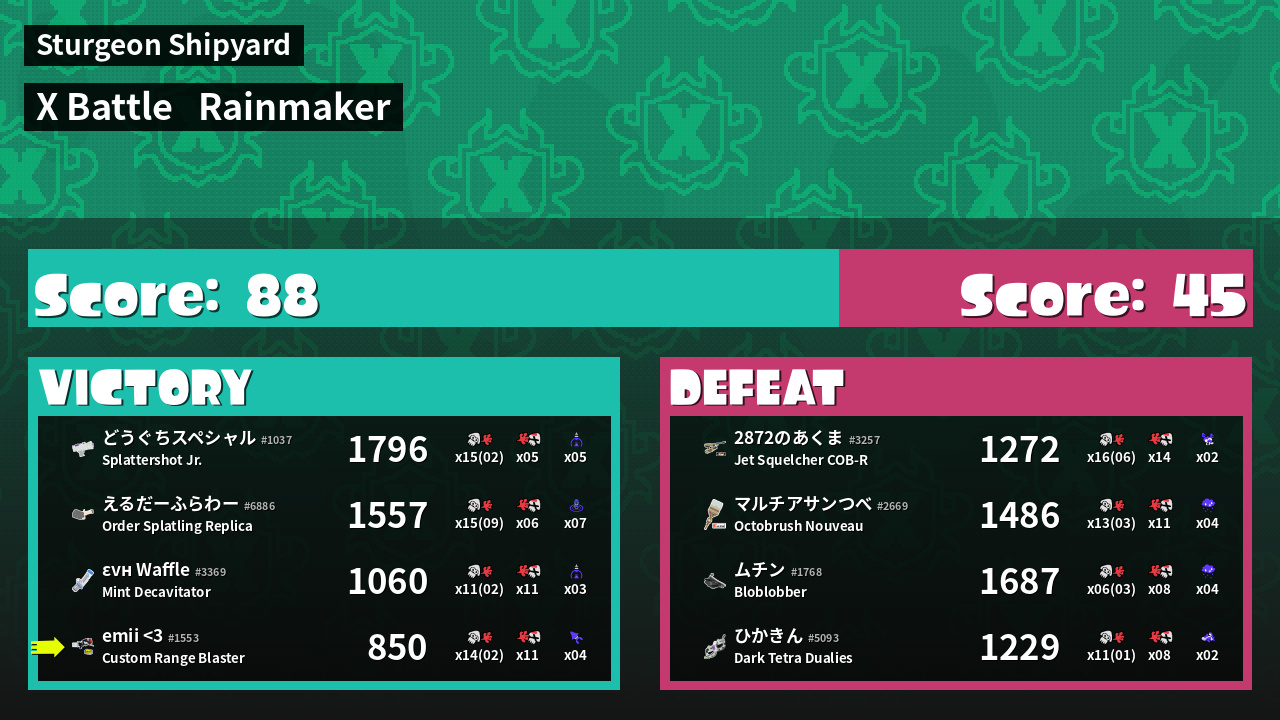 | Medals | #1 Rainmaker Stopper First Splat! #1 Kraken Royale User | ||